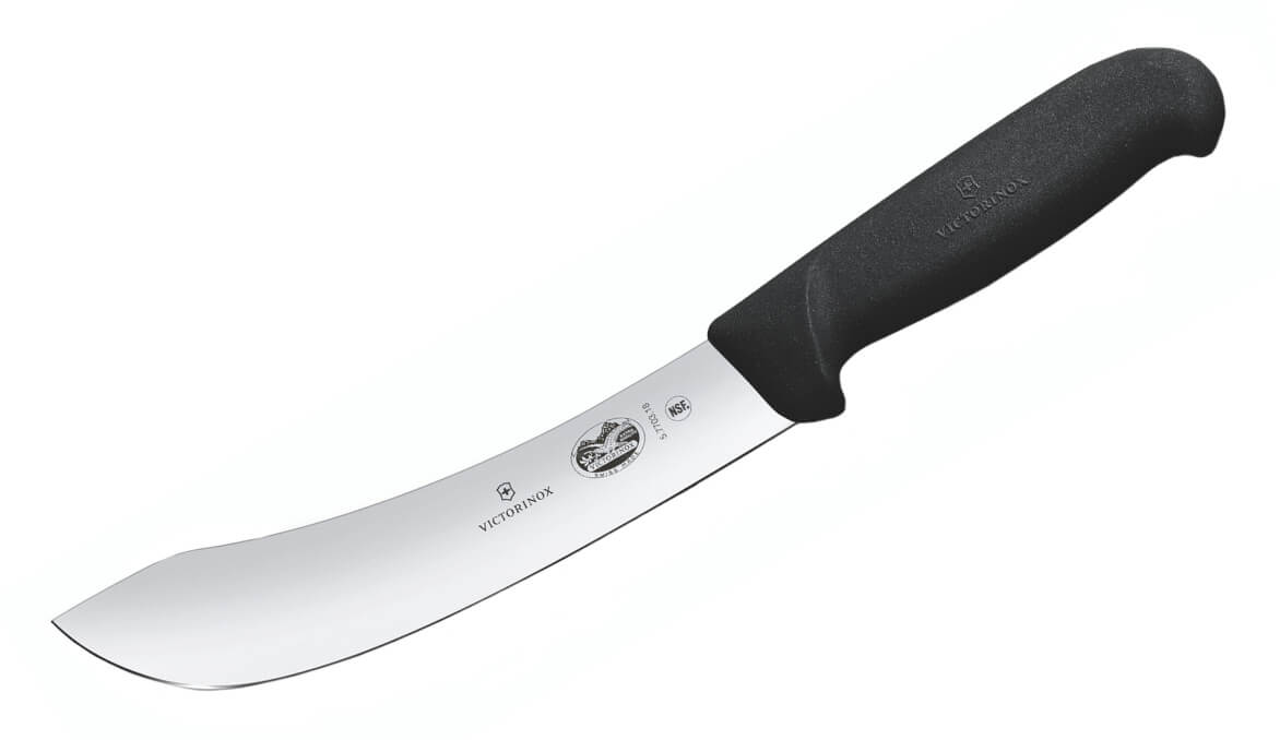 Victorinox Skinning knife. Black non slip ergonomic fibrox handle. 7” special curved wide stiff blade
